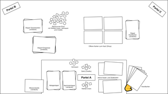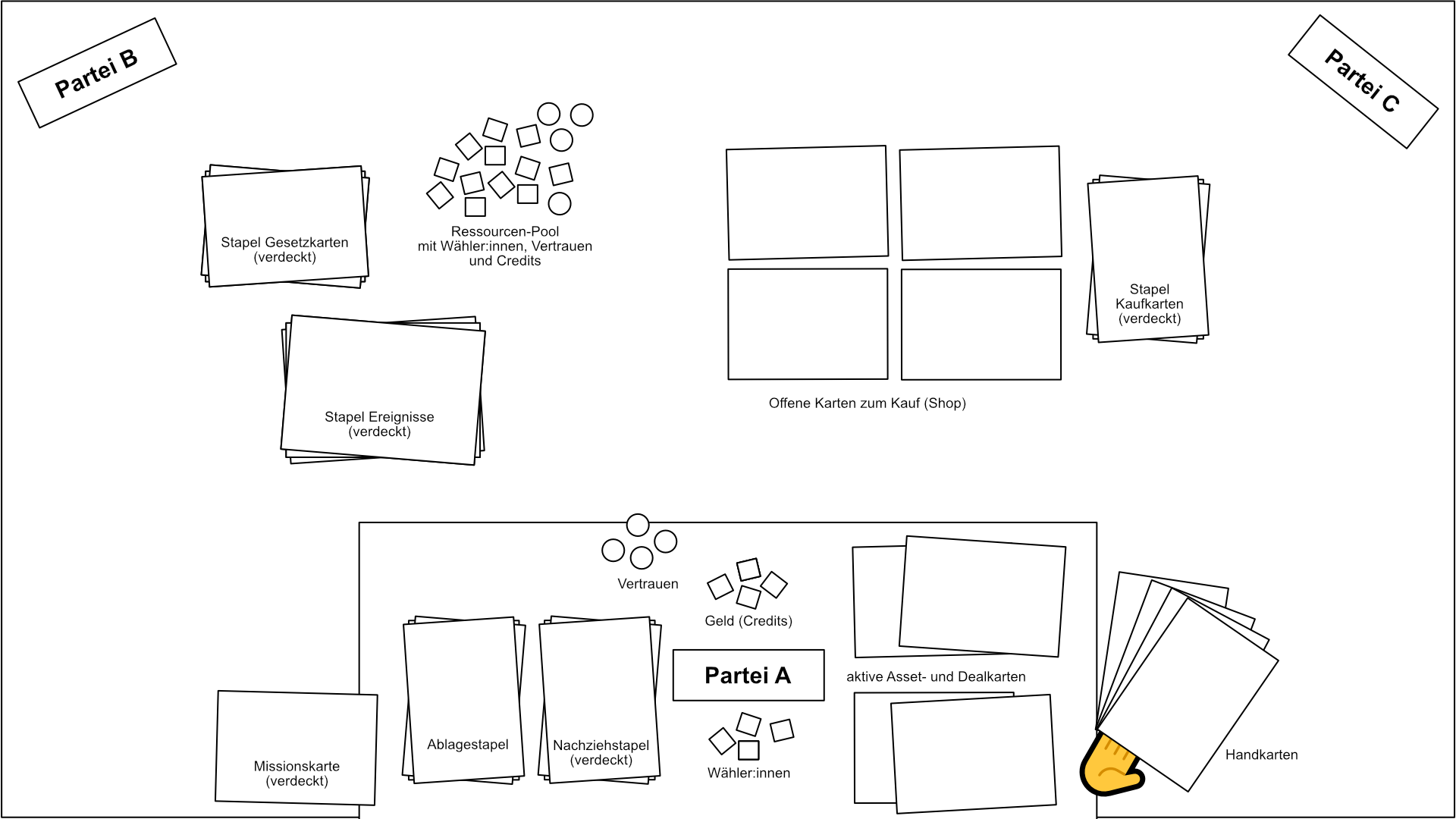 Es werden auch Spielsteine in verschiedenen Farben für die Ressourcen Geld (Credits), Wähler:innen und Vertrauen gebraucht; hier können allerdings auch Alternativen gewählt werden (s. Anleitung).
